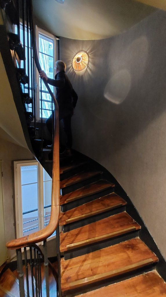 Hissi on tyypillisen pieni, vanhoihin taloihin ei ole helppoa tehdä hissikuiluja jälkeenpäin. (Harvemmin niitä on ollut 1800 luvulla tai 1900 luvun alussa rakennussuunnitelmissa.) Tai siis oikeastaan se koppi oli superpieni. Iloinen virkailija tilasi meille hissin ja matkakaveri meni laukun kanssa hissiin. En mahtunut perässä. Tai olisin mahtunut jos olisin istunut sen laukun päälle. Ei mitään hätää, en käytä hissiä muutenkaan juuri koskaan, mutta olisin halunnut astua kyytiin ehkä vain siksi, että tuo virkailijan toiveikas hymy hissin saavuttua ei olisi mennyt hukkaan. Laitoin vastahymyn peliin ja lähdin nousemaan kapeita ja hurjan kauniita kierreportaita yläkerroksiin.