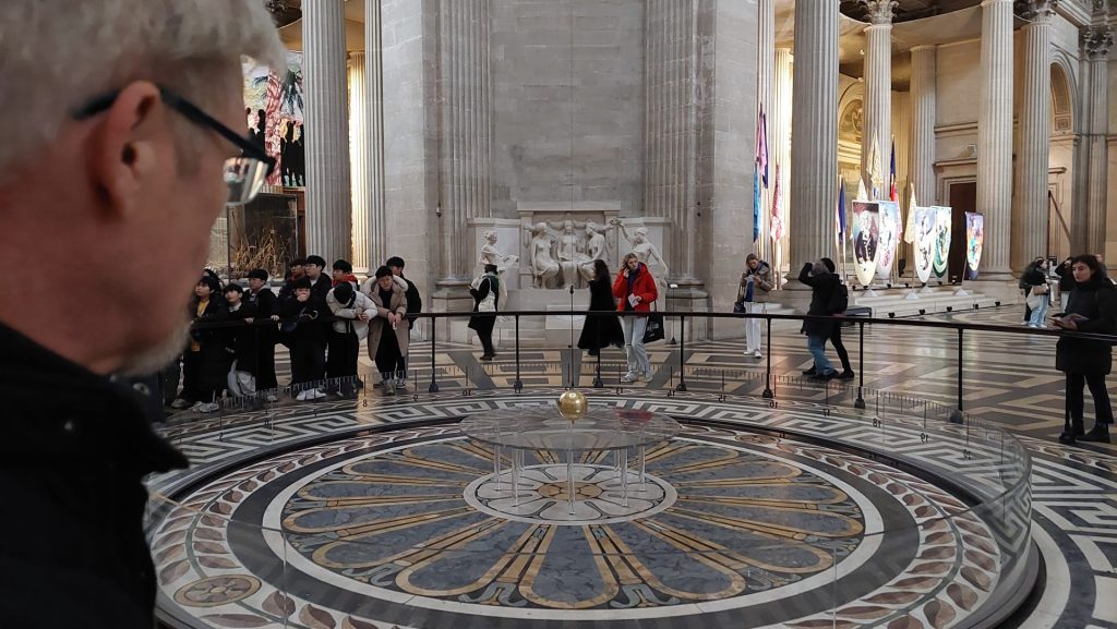 Vielä yhtä ihmeteltäväähän täällä piti tuijotella, eli Foucault:n heiluria. Siinä 67 metriä pitkään vaijeriin on laitettu painava metallipallo roikkumaan. Ja kun maapallo pyörii, niin pallero heiluu. Kaiken lisäksi siitä näkee kellon ajan. Hypnoottinen liike vain jatkuu ja jatkuu, rauhallisesti ja varmasti. Parempi jatkaa matkaa ennenkuin nukahtaa.