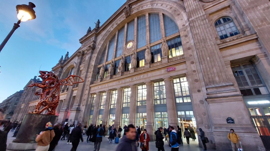 Päätettiin lähteä vielä viimeiselle kävelylle ympäristöön. Jalat kuljettivat meitä Gare de Nordin asemalle, jossa päätettiin ostaa samalla junaliput huomisaamun junaan. Olisivat nekin valmiina, kentälle mennessä on aina vähän väsy ja vielä kiirekin päälle. Aseman seutu oli vilkas ja täynnä valoja hämärtyvässä illassa.